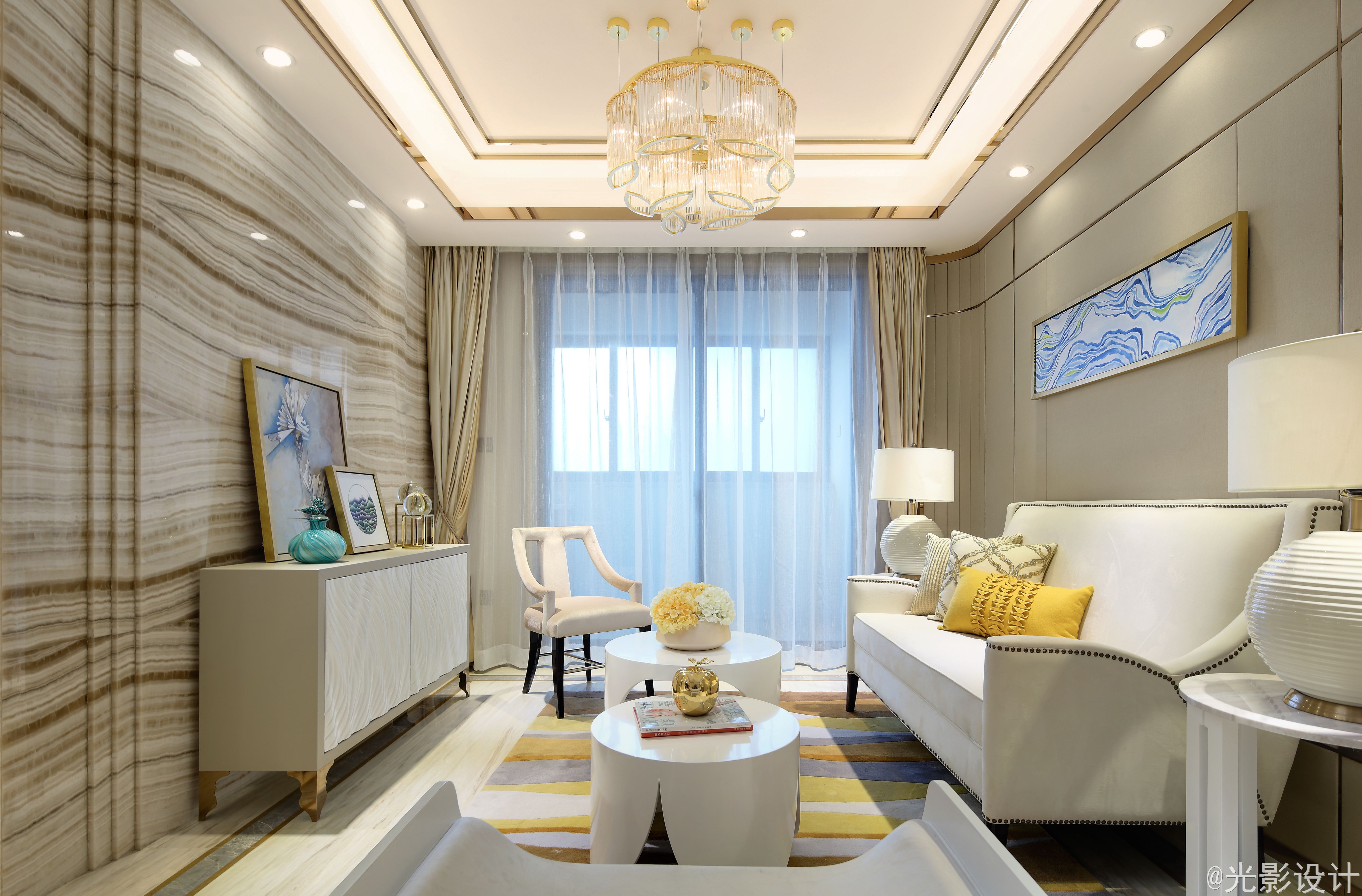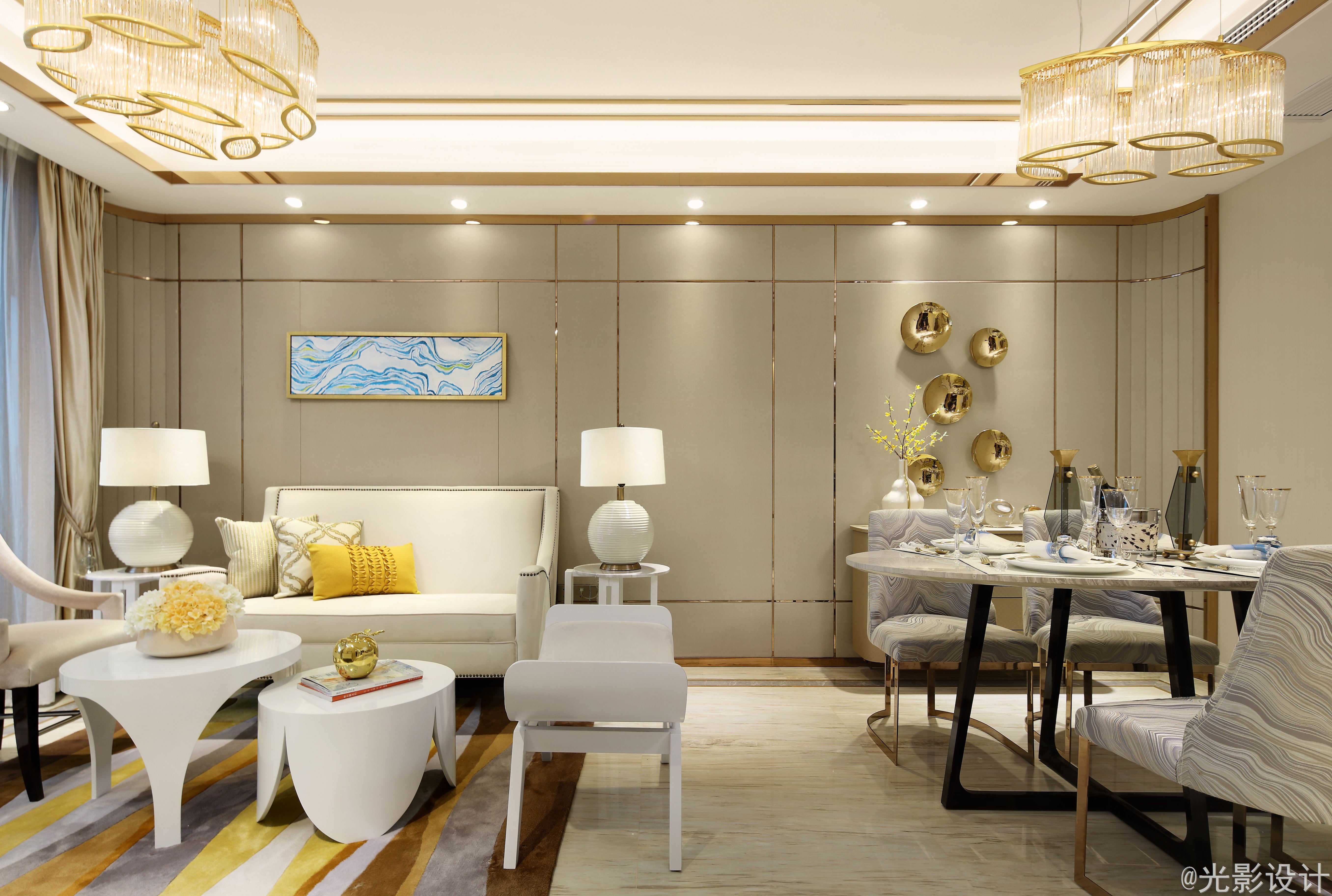 本案以米白色系为基础色调,注入自然清新的黄、蓝、金等色彩。让居室多了一抹恬静淡雅,变得更加从容不迫。